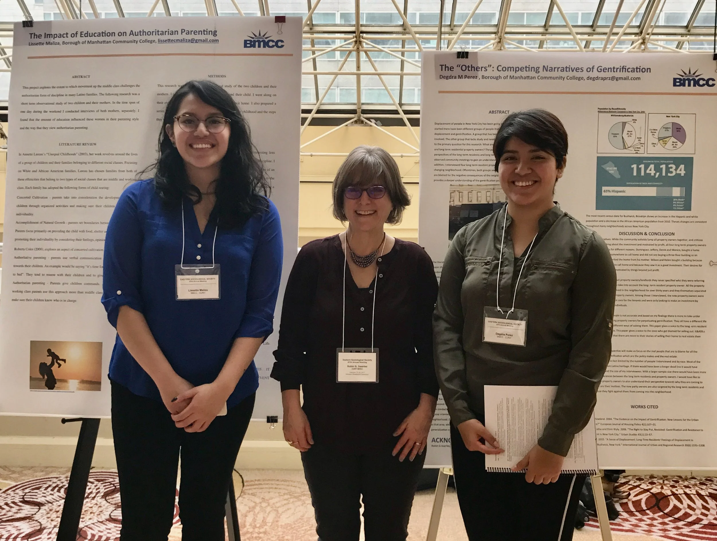 Robin with two Capstone students, Lissette Maliza and Degdra Perez, presenting their research at the Annual Meeting of the Eastern Sociological Society, Philadelphia, 2017. Both Lissette (City College) and Degdra (Hunter College) have earned their BA in Sociology and are currently applying to graduate programs.